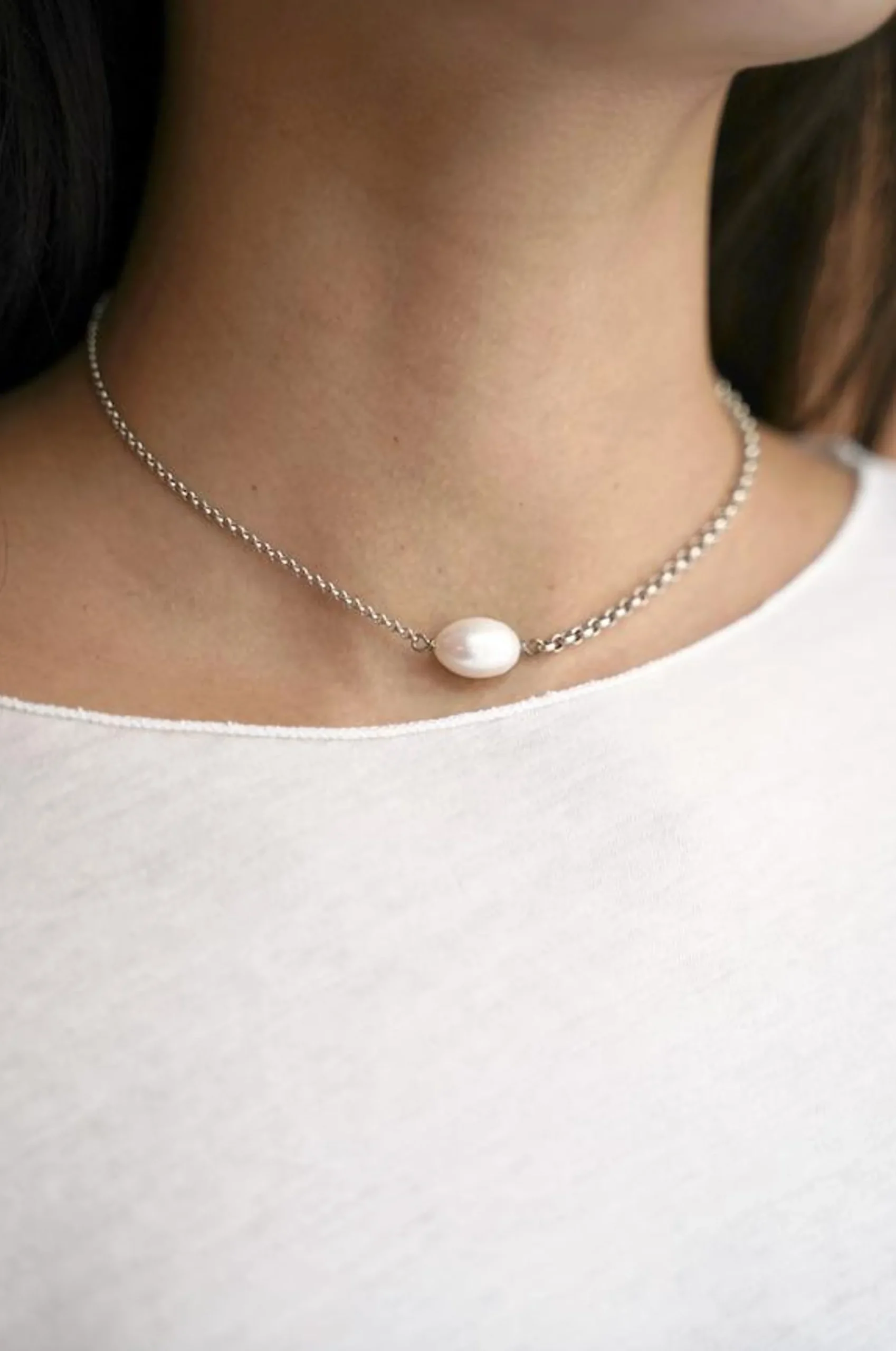 Collier Court Nava Perle En Laiton Plaqué Argent, Orné D’Une Perle Naturelle