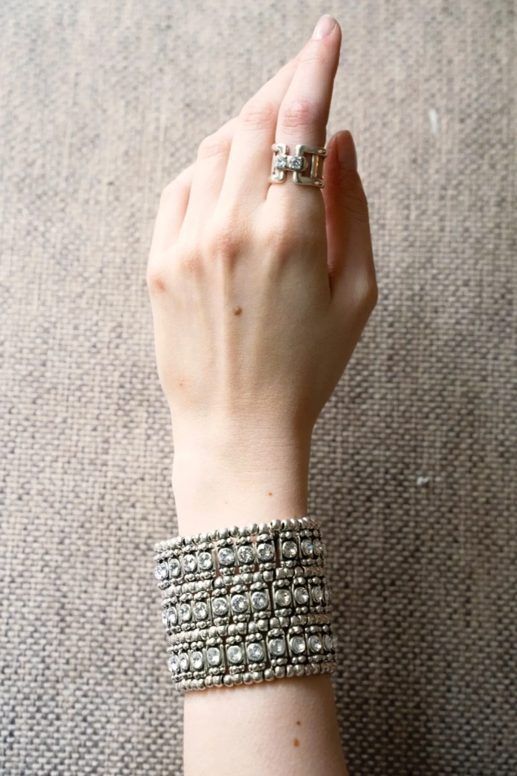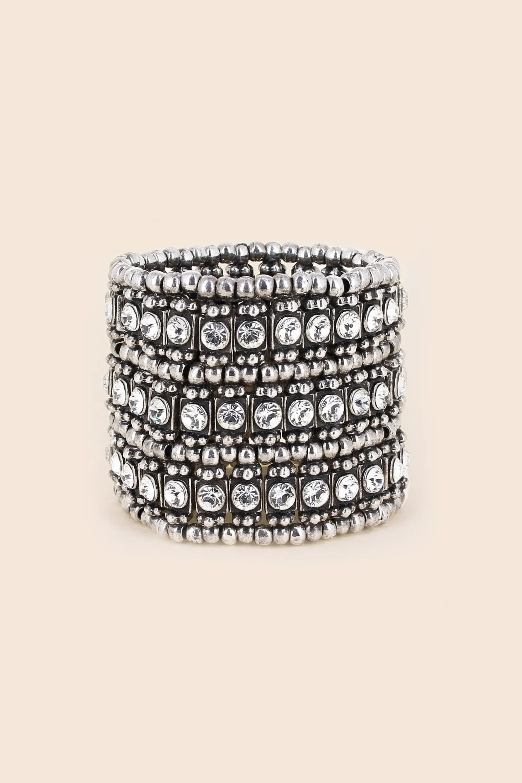 Manchette Élastique Retro Roselyne 3 Rangs Strass Ronds, En Étain Plaqué Argent Et Orné De Cristaux Swarovski